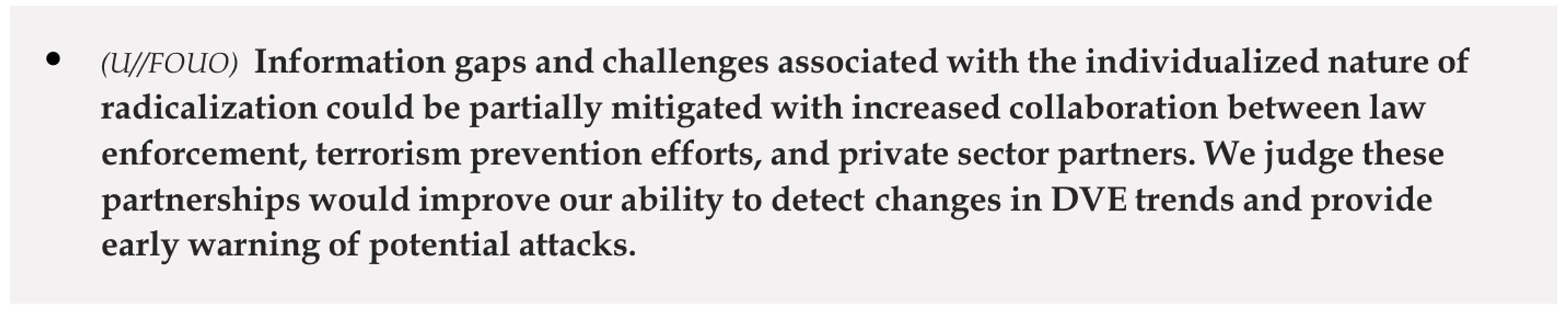 Übersetzung:U/FOUO) Informationslücken und Herausforderungen, die mit der individuellen Natur der Radikalisierung verbunden sind, könnten durch eine verstärkte Zusammenarbeit zwischen Strafverfolgungsbehörden, Terrorismusprävention und Partnern aus dem Privatsektor teilweise gemildert werden. Wir sind der Meinung, dass diese Partnerschaften unsere Fähigkeit verbessern würden, Veränderungen bei DVE-Trends zu erkennen und frühzeitig vor möglichen Anschlägen zu warnen."