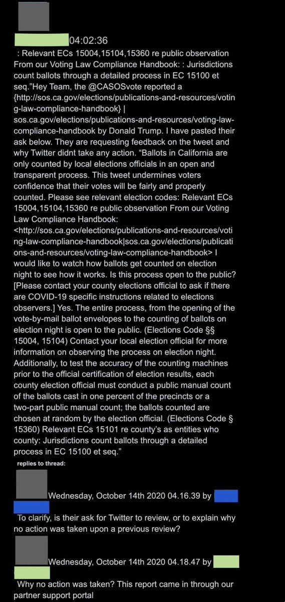 28. Zu einem schreibt sie: "Ein bestimmter Tweet über die Verwendung von Modems in Illinois zur Übermittlung von Wahlergebnissen wurde als möglicher Verstoß gegen die Politik der bürgerlichen Integrität gekennzeichnet (außer, dass sie diese Technik unter bestimmten Umständen verwenden)."