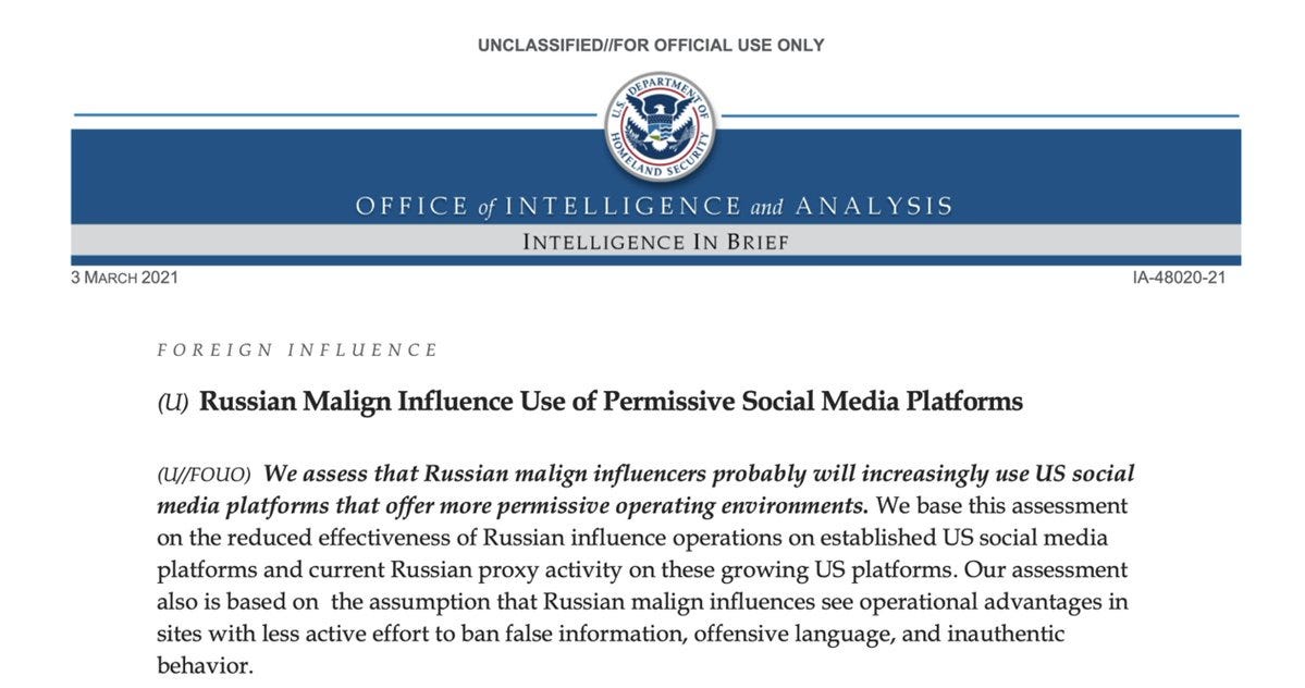 (UFOUO) Wir gehen davon aus, dass russische böswillige Einflussnahme wahrscheinlich zunehmend US-Plattformen für soziale Medien nutzen wird, die ein freizügigeres Arbeitsumfeld bieten. Wir stützen diese Einschätzung auf die geringere Wirksamkeit russischer Einflussnahme auf etablierten US-Plattformen für soziale Medien und die derzeitigen Aktivitäten russischer Stellvertreter auf diesen wachsenden US-Plattformen. Unsere Einschätzung basiert auch auf der Annahme, dass russische böswillige Einflussnehmer operative Vorteile auf Seiten sehen, die weniger aktiv gegen falsche Informationen, beleidigende Sprache und unauthentisches Verhalten vorgehen.”