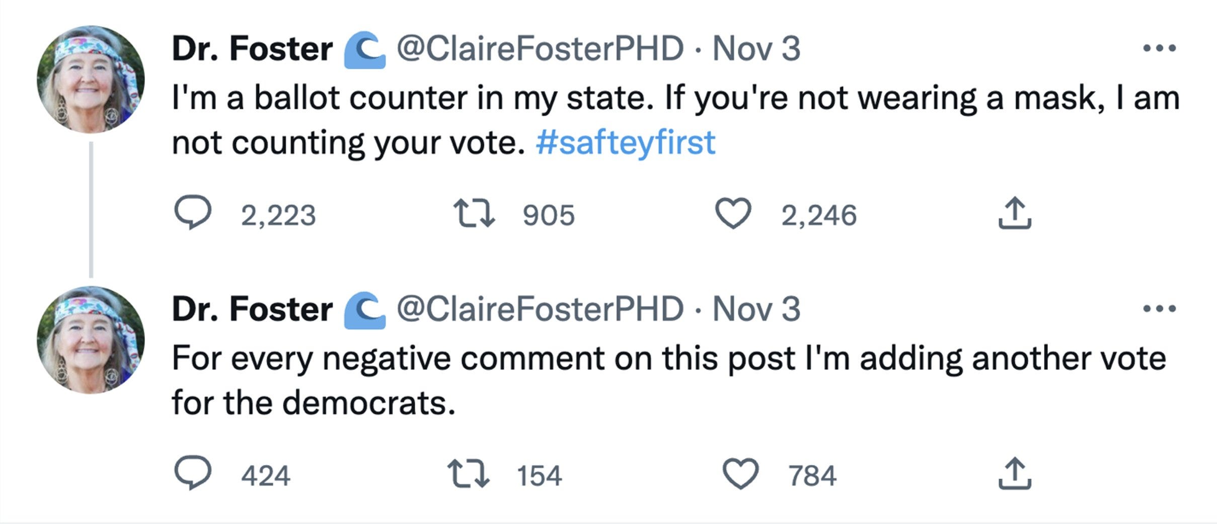 Der Twitter-Account "@ClaireFosterPHD" behauptete in ihren Beiträgen, dass sie in ihrem Bundesstaat als Wahlzählerin tätig sei, und erklärte in weiteren Beiträgen: "Für jeden negativen Kommentar zu diesem Beitrag füge ich eine weitere Stimme für die Demokraten hinzu" und "Wenn du keine Maske trägst, zähle ich deine Stimme nicht".