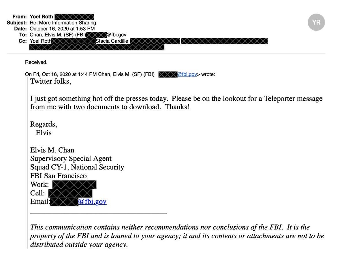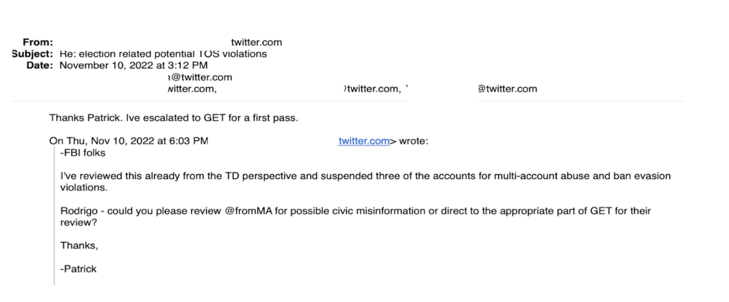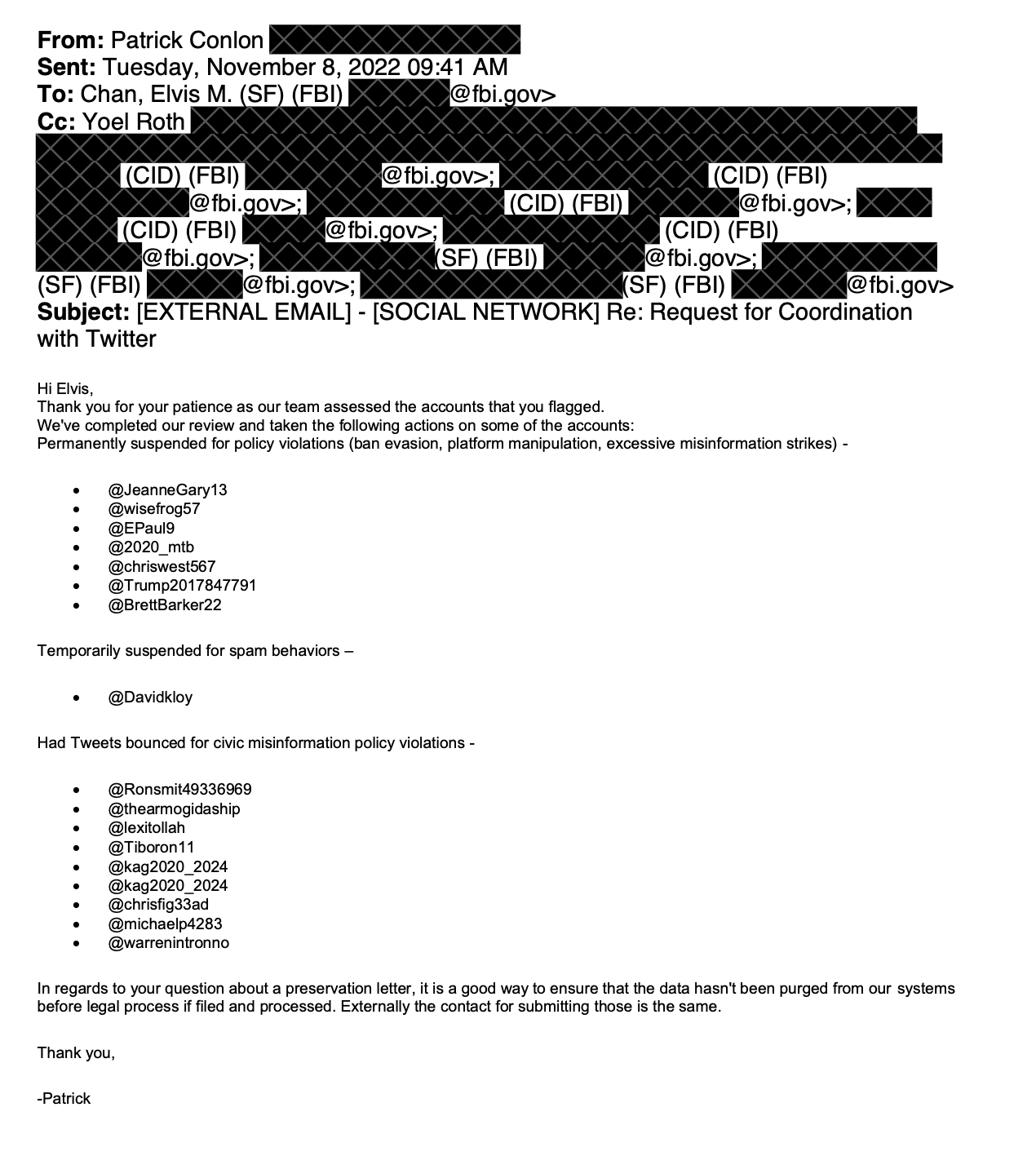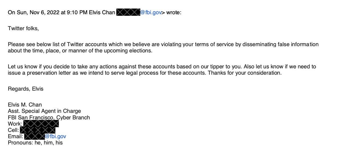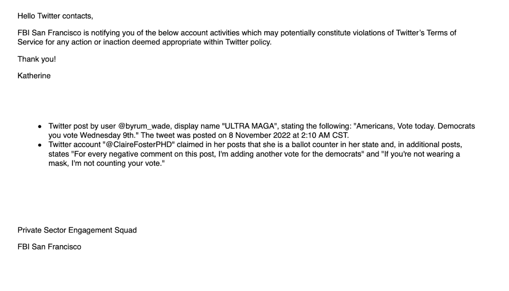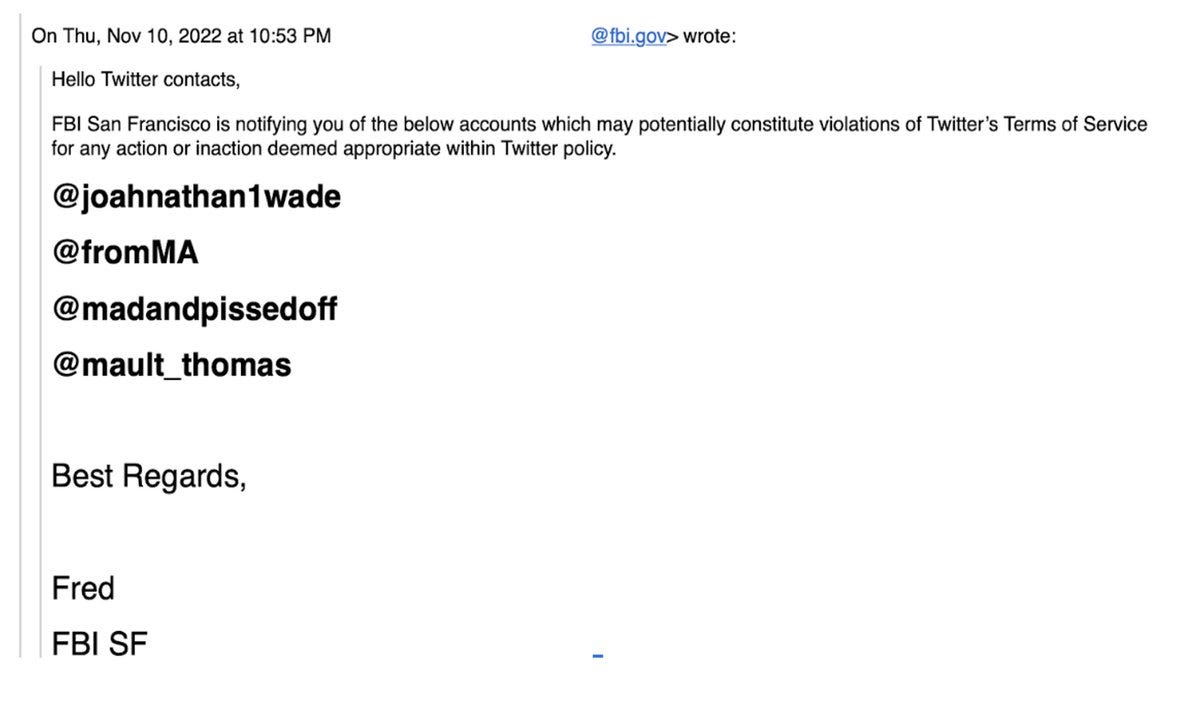 13."HALLO TWITTER-KONTAKTE": Die hierarchische Qualität der Beziehung des FBI zu Twitter wird in dieser E-Mail vom November 2022 deutlich, in der das "FBI San Francisco Sie benachrichtigt", dass es gegen vier Accounts vorgehen will: