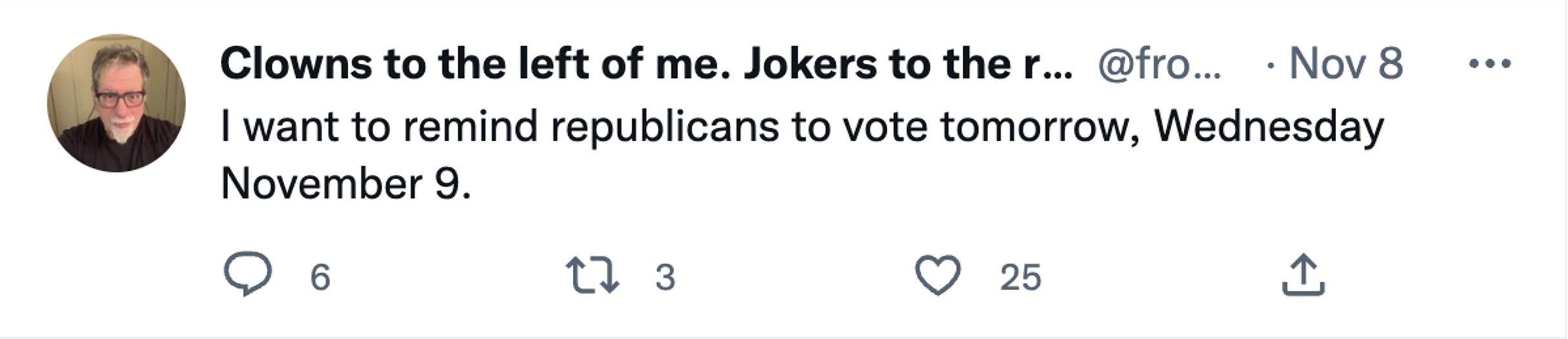 Twitter-Post des Nutzers @byrum_wade, Anzeigename "ULTRA MAGA", mit folgendem Inhalt: "Amerikaner, wählt heute. Demokraten, ihr wählt am Mittwoch, den 9.". Der Tweet wurde am 8. November 2022 um 2:10 AM CST gepostet.