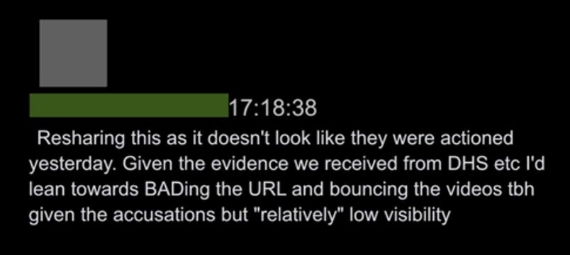 Übersetzung: “Ich teile dies erneut, da es nicht so aussieht, als wäre gestern etwas unternommen worden. In Anbetracht der Beweise, die wir von DHS usw. erhalten haben, würde ich angesichts der Anschuldigungen, aber der "relativ" geringen Sichtbarkeit, dazu tendieren, die URL zu sperren und die Videos zu bouncen.”