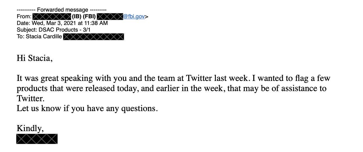 31. In dieser E-Mail vom März 2021 bedankt sich ein FBI-Verbindungsmann bei einem leitenden Twitter-Mitarbeiter für die Möglichkeit, mit "Ihnen und dem Team" zu sprechen, und übergibt dann ein Paket mit "Produkten":