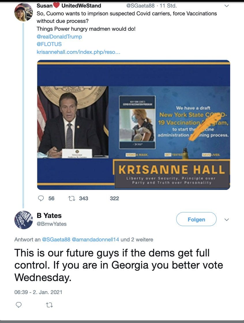 Übersetzung: Cuomo will also mutmaßliche Covid-Träger inhaftieren und Impfungen ohne ordentliches Verfahren erzwingen?
