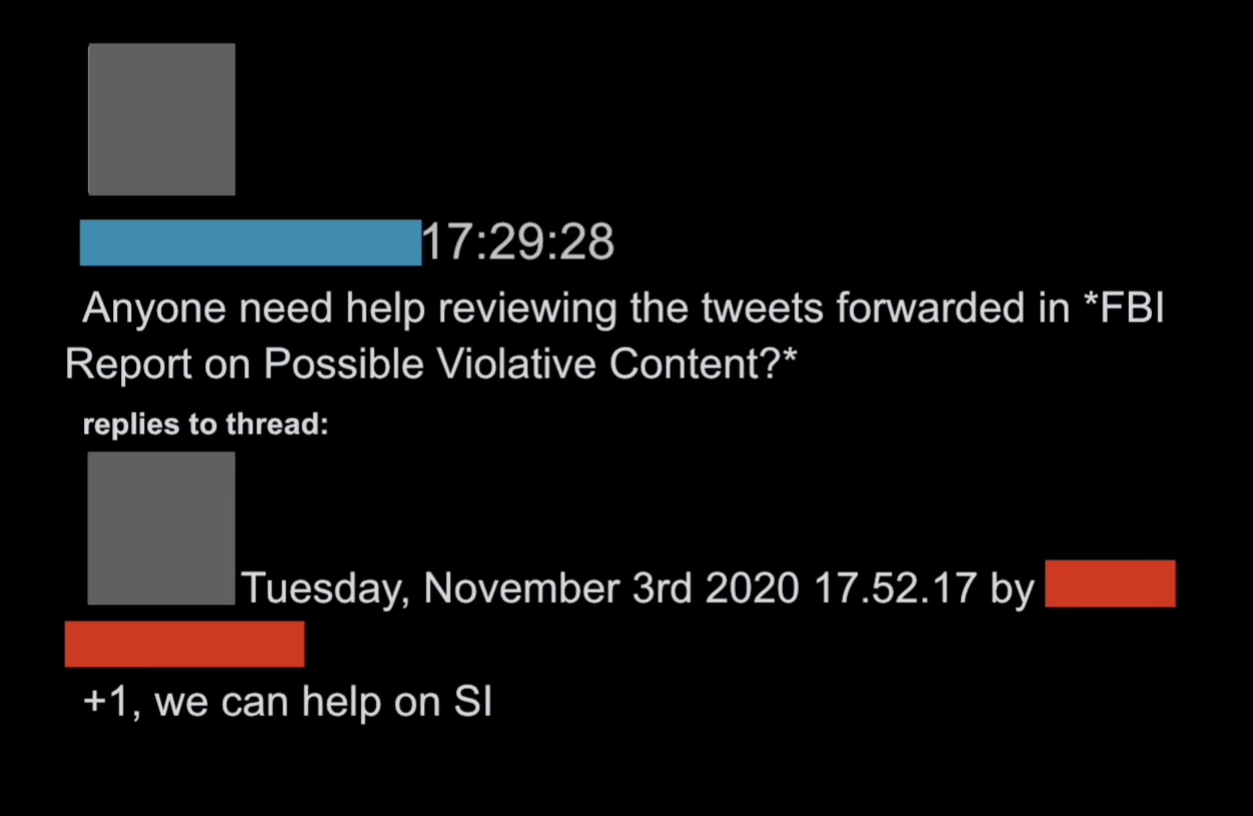 Übersetzung: “Braucht jemand Hilfe bei der Überprüfung der Tweets, die im *FBI Report on Possible Violative Content?* weitergeleitet wurden?”