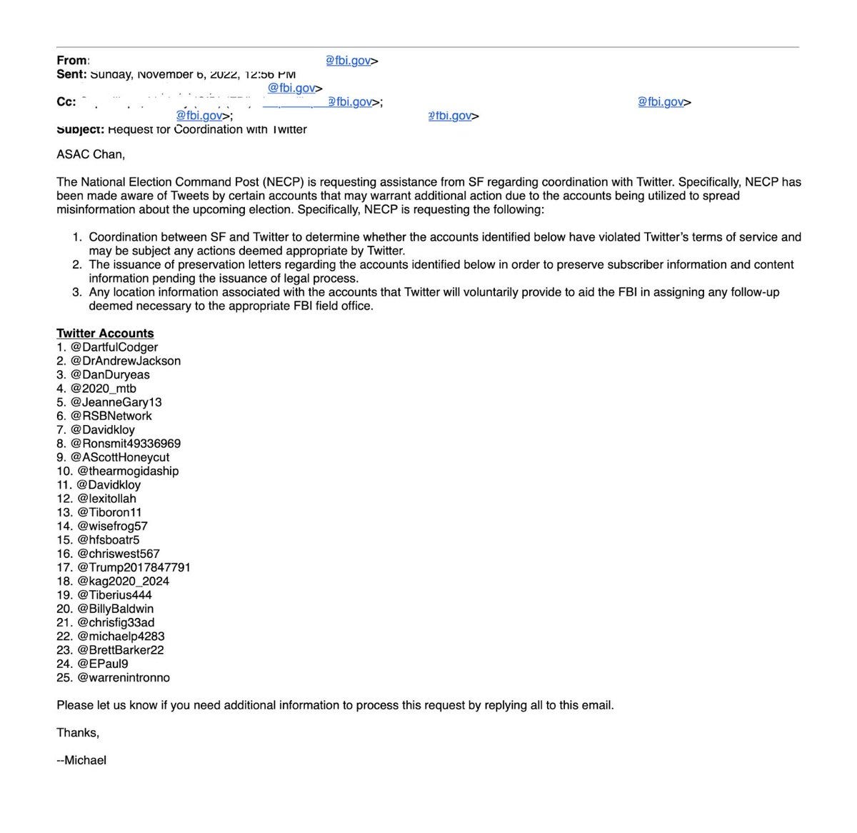 18. In einer internen E-Mail vom 5. November 2022 übermittelte das National Election Command Post des FBI, das Beschwerden sammelt und weiterleitet, der SF-Außenstelle eine lange Liste von Konten, die "zusätzliche Maßnahmen rechtfertigen könnten":
