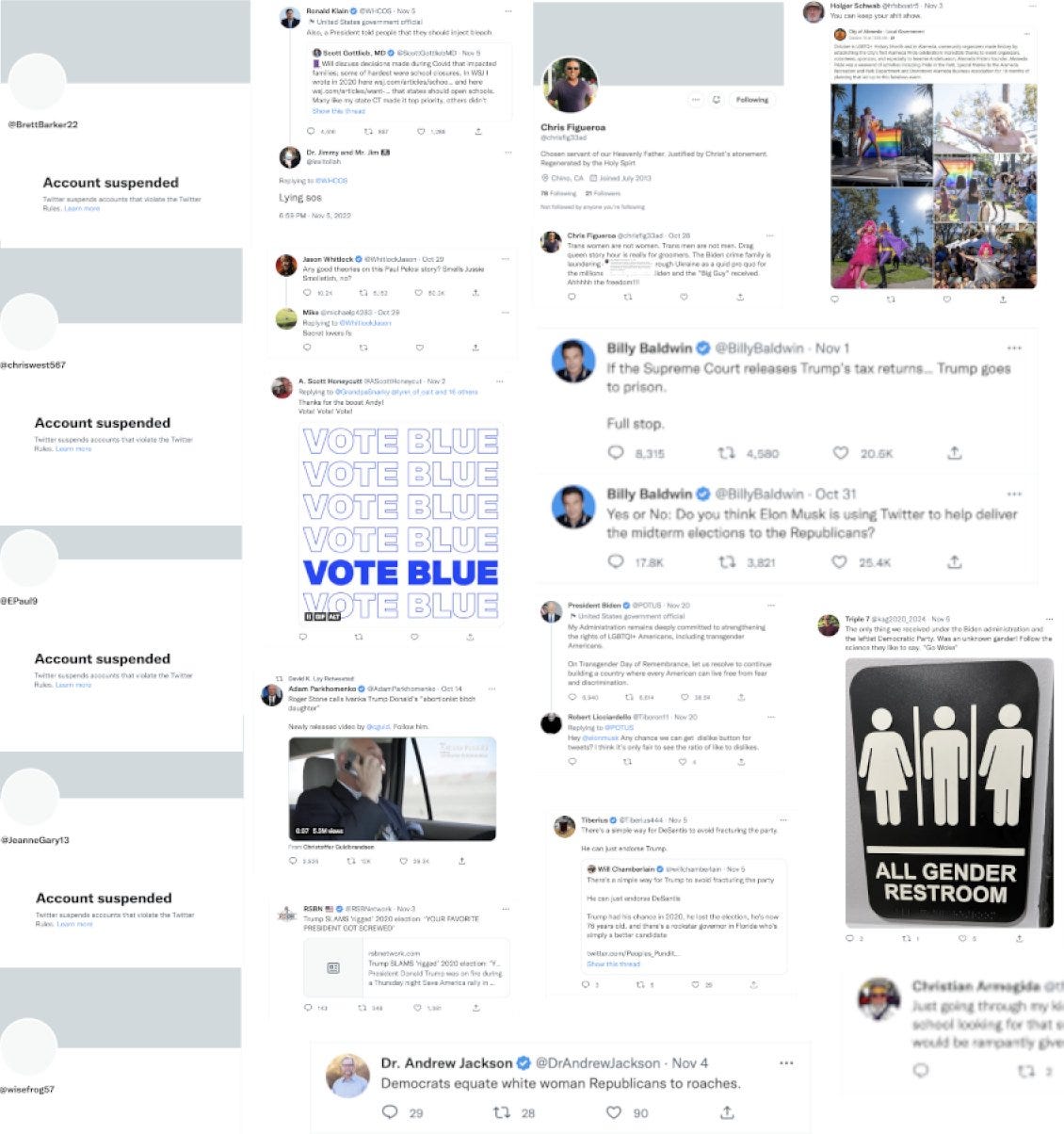 Im Folgenden finden Sie eine Liste von Twitter-Konten, die unserer Meinung nach gegen Ihre Nutzungsbedingungen verstoßen, indem sie falsche Informationen über Zeit, Ort oder Art und Weise der bevorstehenden Wahlen verbreiten. Lassen Sie uns wissen, ob Sie aufgrund unseres Hinweises Maßnahmen gegen diese Konten ergreifen werden. Teilen Sie uns auch mit, ob wir einen Schutzbrief ausstellen müssen, da wir beabsichtigen, diese Konten gerichtlich zu belangen.